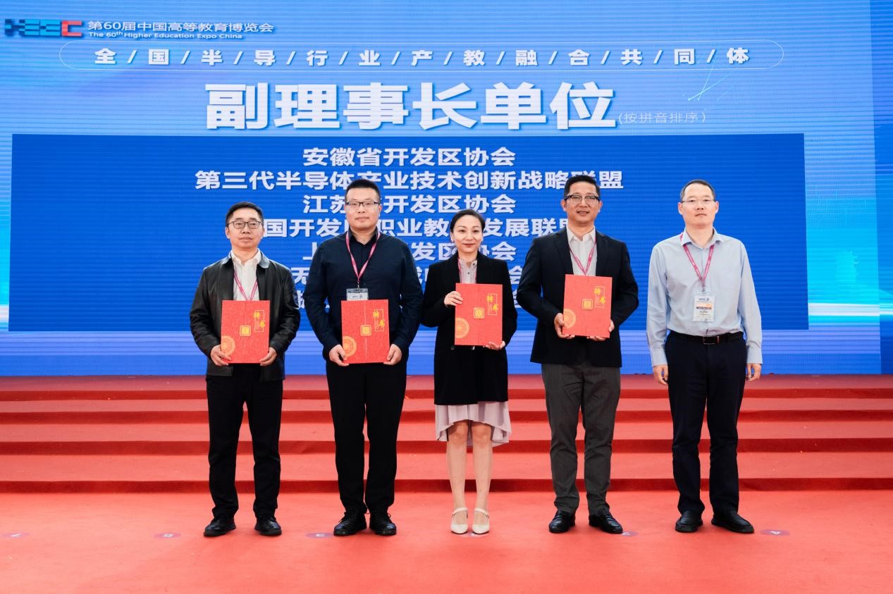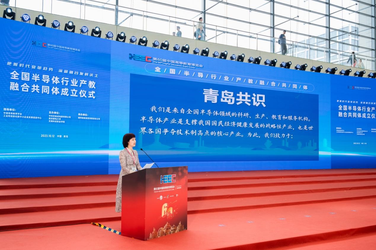 10月12日,作為第60屆中國高等教育博覽會內容之一,全國半導體行業產教融合共同體成立儀式在青島舉行。本次大會由中國高等教育學會、工業和信息化部中小企業發展促進中心指導,中科芯集成電路有限公司、南京郵電大學、無錫科技職業學院聯合主持。教育部職業教育與成人教育司副司長林宇,中國高等教育學會副會長葛道凱等領導發表致辭,來至全國各地200多名院校領導和企業代表參加會議,從產業交流、技術討論、人才培養、供需對接等方面探討半導體行業創新人才的培養體系構建。