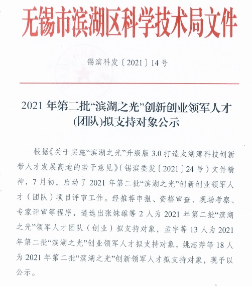 根據《關于實施“濱湖之光”升級版3.0打造太湖灣科技創新帶人才發展高地的若干意見》(錫濱委發〔2021〕24號)文件精神,7月初,濱湖區啟動了2021年第二批“濱湖之光”創新創業領...
